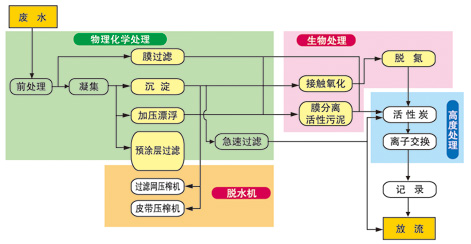 采用化学和物理相结合的原则进行污水处理,化学部分主要为加药反应,物理部分主要为过滤和吸附。